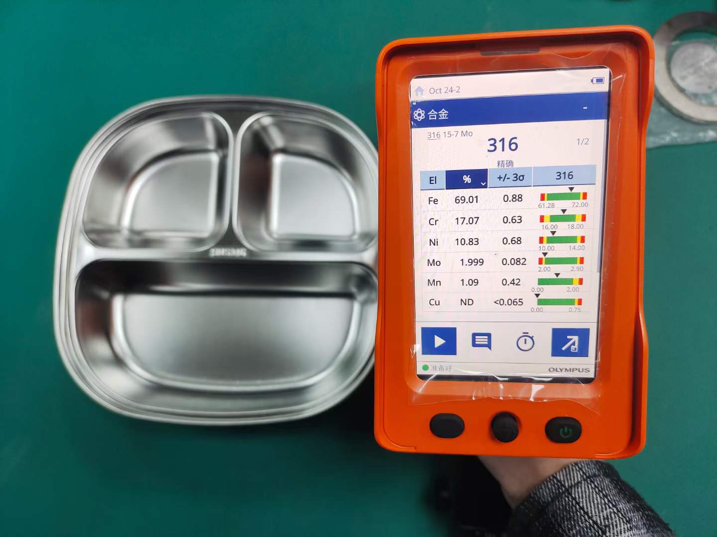 圖為奧林巴斯手持光譜儀檢測出合格的316、304不銹鋼餐具