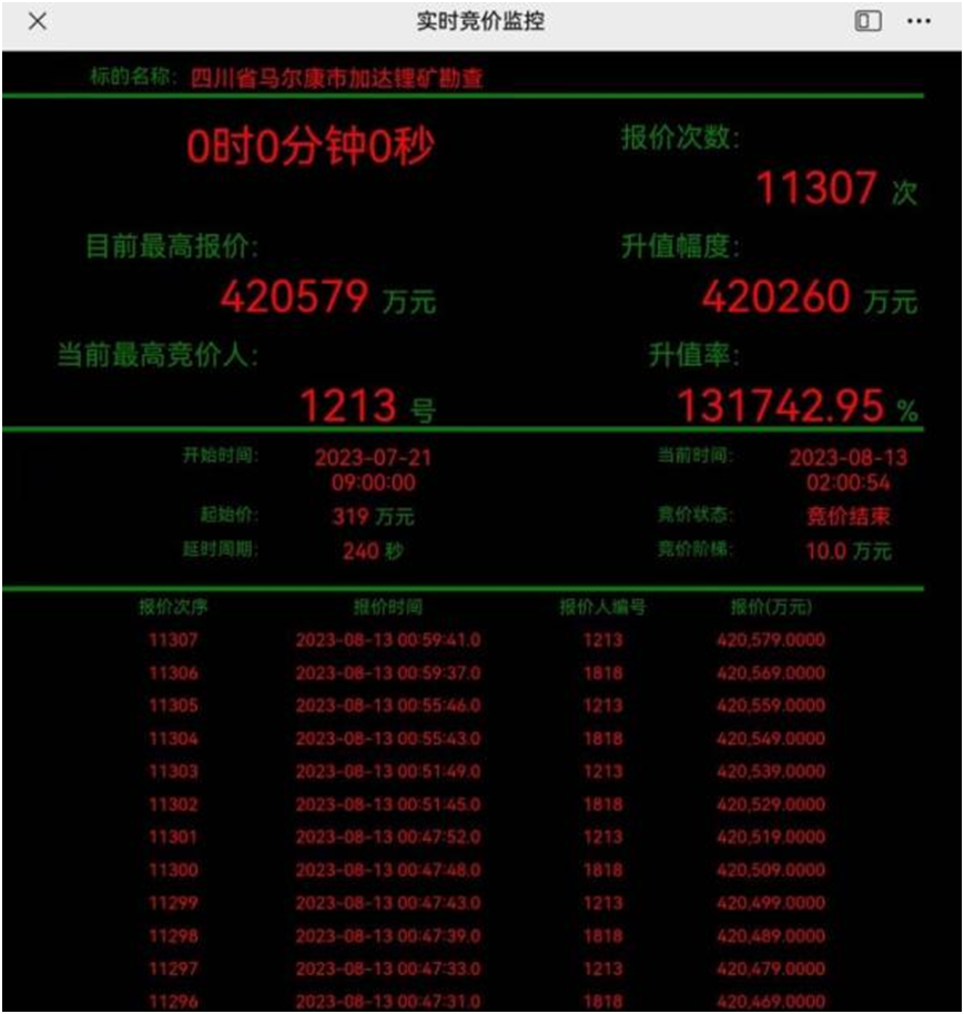 值得注意的是,三天前(8月11日),四川能投資本控股有限公司以10.1億元的價(jià)格拍得四川省金川縣李家溝北鋰礦探礦權(quán)。該筆競(jìng)價(jià)交易同樣鏖戰(zhàn)2天,報(bào)價(jià)次數(shù)3412次,較57萬(wàn)元起拍價(jià)升值超1771倍。