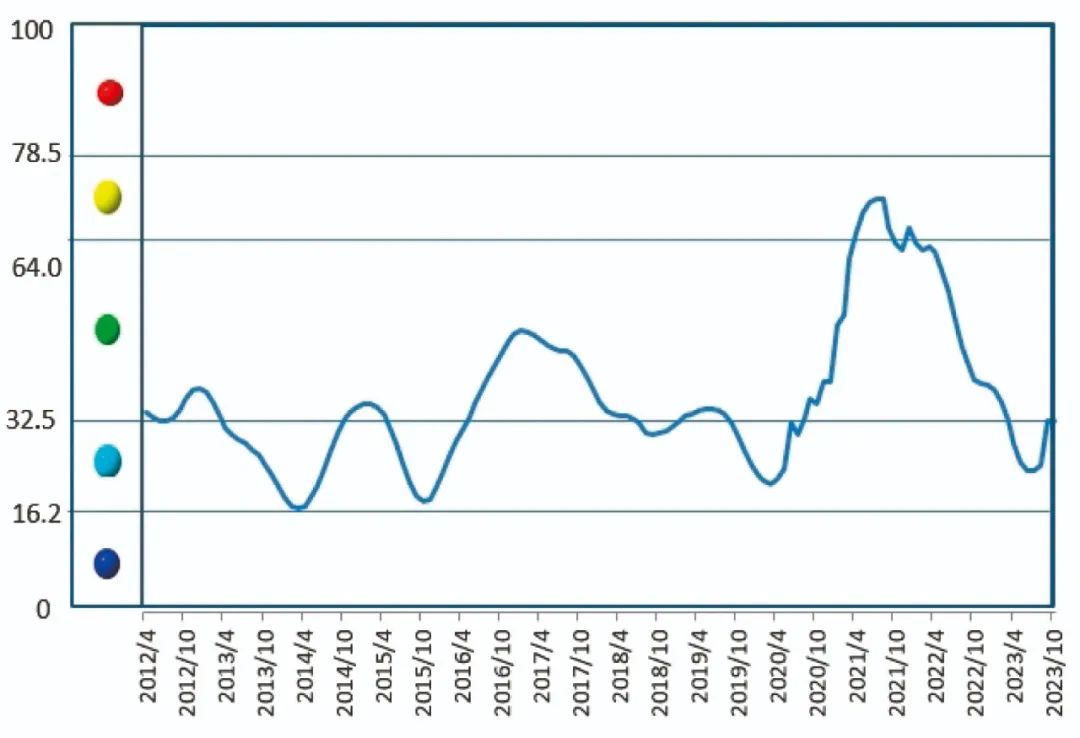 2023年10月份,中國鋁冶煉產業景氣指數為32.6,較上月上升1.3個點,處于“正常”區間下部。中國鋁冶煉產業月度景氣指數走勢見圖1。