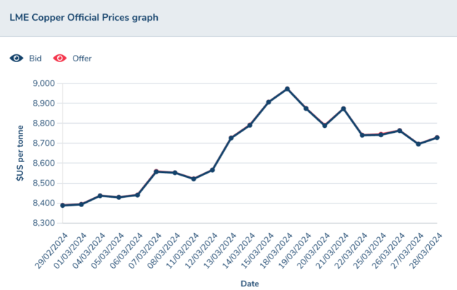 3月份以來全球銅價持續(xù)走高,3月16日,國際銅價(LME銅)一度上破至9000美元/噸關口;截至當前,國際銅價依然超過8700美元/噸。