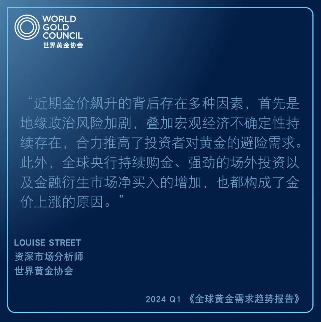 世界黃金協會資深市場分析師路易斯·斯特里特(Louise Street)分析稱:“近期金價飆升的背后存在多種因素,首先是地緣政治風險加劇,疊加宏觀經濟不確定性持續存在,合力推高了投資者對黃金的避險需求。此外,全球央行持續購金、強勁的場外投資及金融衍生市場凈買入的增加,也都構成了金價上漲的原因。東西方投資者的行為趨勢正在發生轉變。