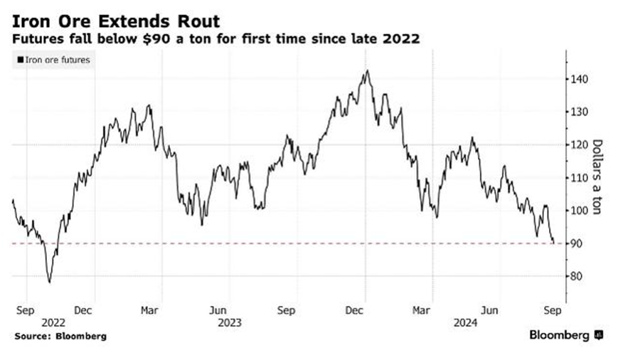 9月9日,新加坡鐵礦石期貨價(jià)格周一亞洲時(shí)段早盤跌幅一度高達(dá)2.3%,至每噸89.60美元,自2022年11月以來首次跌破了90美元大關(guān),為22個(gè)月以來最低水平。國內(nèi)青島港的鐵礦石價(jià)格也跌至90美元/干噸左右。昔日被業(yè)內(nèi)譽(yù)為“瘋狂的石頭”的鐵礦石,如今正在以罕見的速度向下墜落。