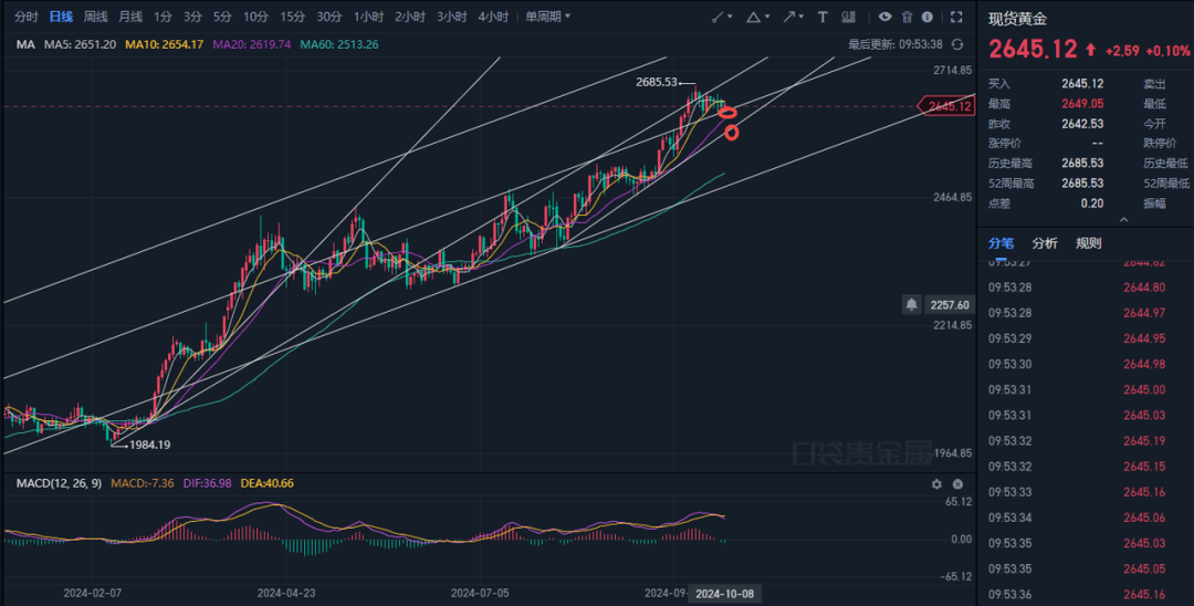 行情回顧:近期就業(yè)數(shù)據(jù)靚麗,投資者降低了對(duì)美聯(lián)儲(chǔ)11月大幅降息的預(yù)期,美元保持強(qiáng)勢(shì),美債收益率時(shí)隔兩個(gè)月首次升破4%,令金價(jià)承壓。現(xiàn)貨黃金延續(xù)回調(diào),錄得日線四連陰,盤(pán)中最低觸及2637.71美元/盎司,最終收跌0.40%,報(bào)2642.63美元/盎司,市場(chǎng)對(duì)美聯(lián)儲(chǔ)降息幅度的預(yù)期減少。