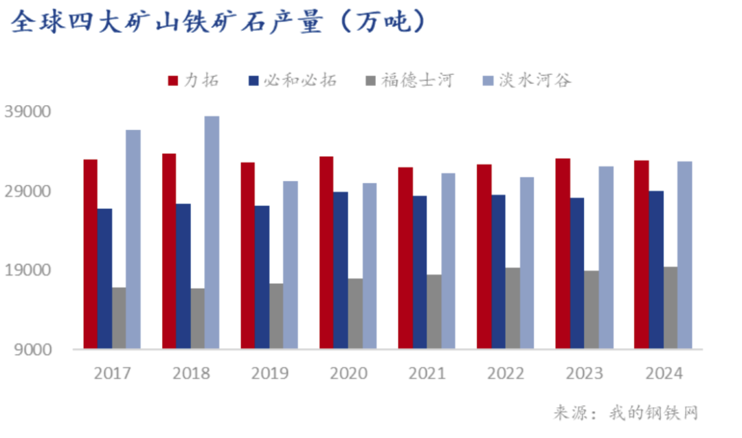 據統計,四大礦山2024年鐵礦石總產量達11.39億噸,同比增加1600萬噸,增幅1.4%。具體來看,澳大利亞三大礦山巨頭表現相對平穩,合計產量超過8億噸,同比增長930萬噸,而巴西的淡水河谷表現則相對突出,淡水河谷2024年鐵礦石產量達到3.28億噸,同比增加652萬噸,超過原定的3.1-3.2億噸指導目標,創下2018年以來的新高。同時,淡水河谷全年鐵礦石銷量實現了約3.07億噸,同比增長4.02%,達到了2019年以來最好的銷量數據。
