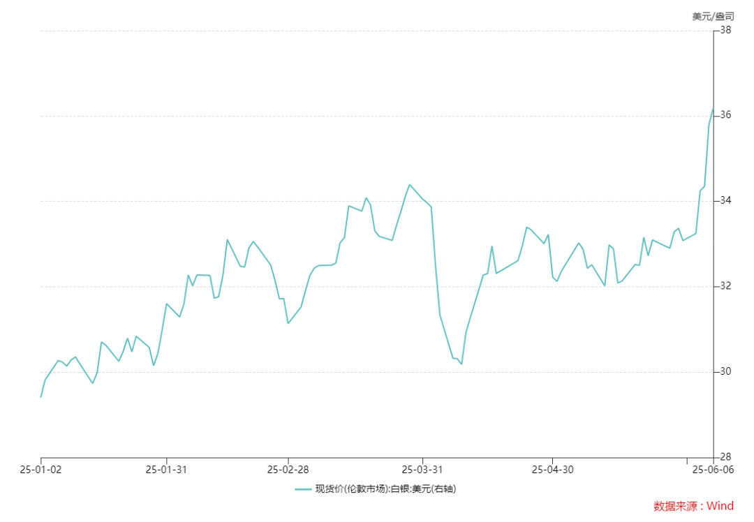 今年以來(lái),在全球經(jīng)濟(jì)和政治不確定性日益加劇的背景下,包括白銀在內(nèi)的貴金屬價(jià)格受到避險(xiǎn)資金的支撐。從年初至今,現(xiàn)貨白銀已累計(jì)漲逾23%。6月6日,現(xiàn)貨白銀價(jià)格最高報(bào)每盎司36.19美元,站上自2012年以來(lái)的新高。