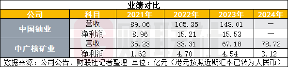 從業(yè)績方面來看,中國鈾業(yè)實力較中廣核礦業(yè)更強(qiáng),2021-2023年中國鈾業(yè)營收分別為89.06億元、105.35億元、148.01億元,凈利潤分別為8.96億元、15.21億元、15.53億元;2021-2024年中廣核礦業(yè)營收分別為38.60億港元、36.49億港元、73.60億港元、86.24億港元,凈利潤分別為1.78億港元、5.15億港元、4.97億港元、3.42億港元。